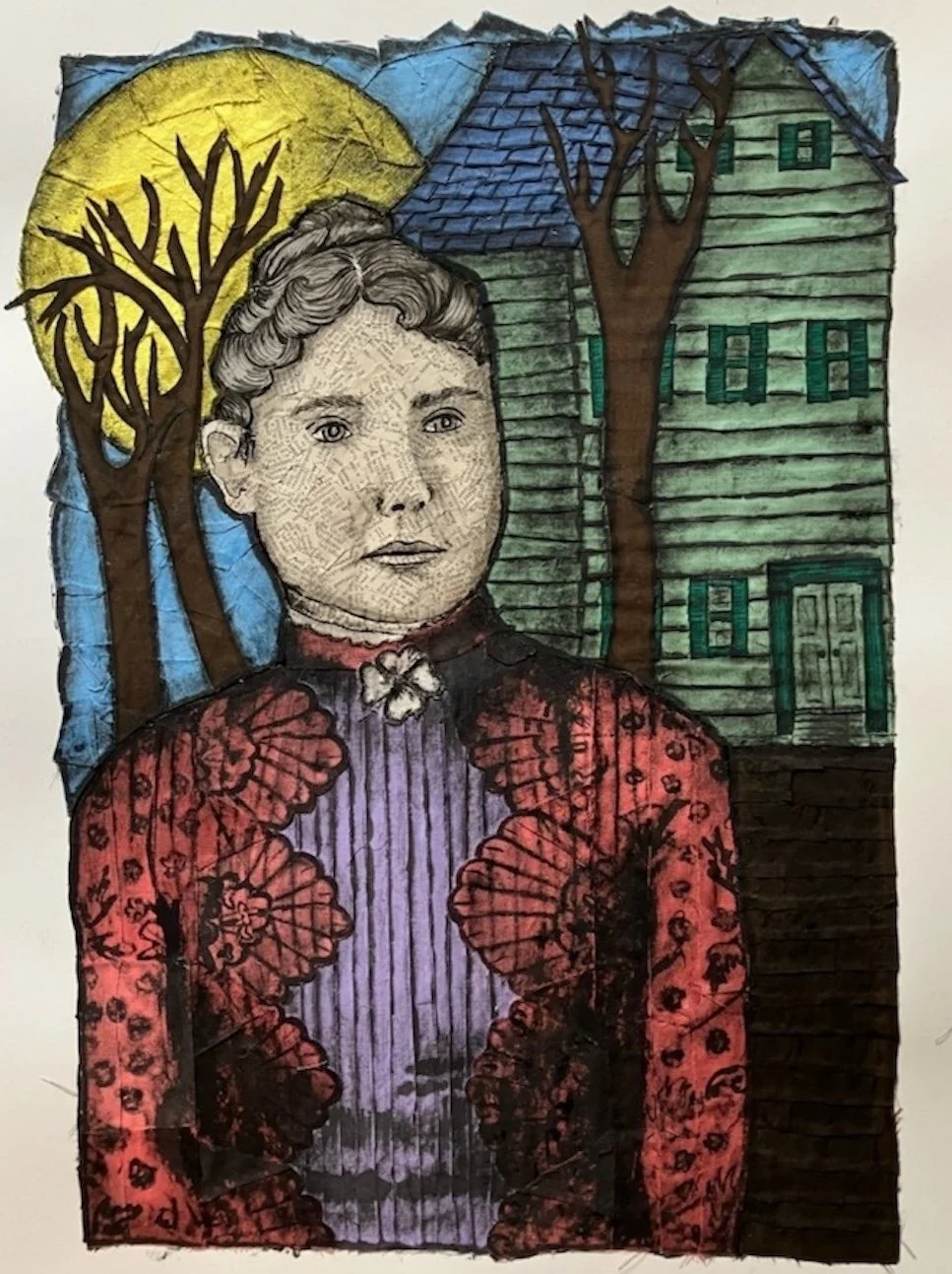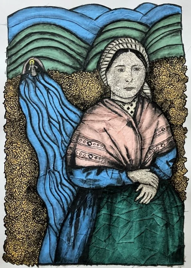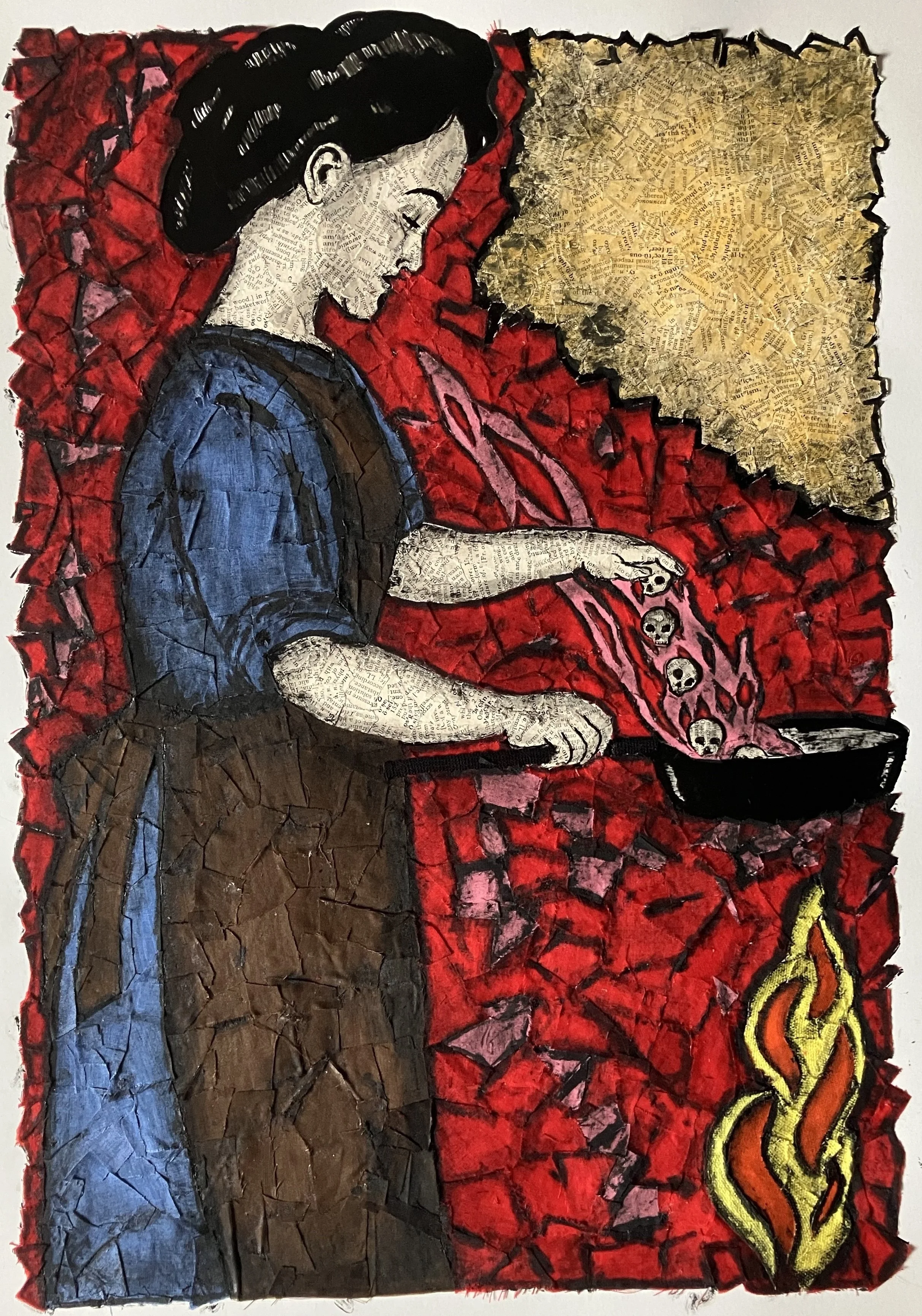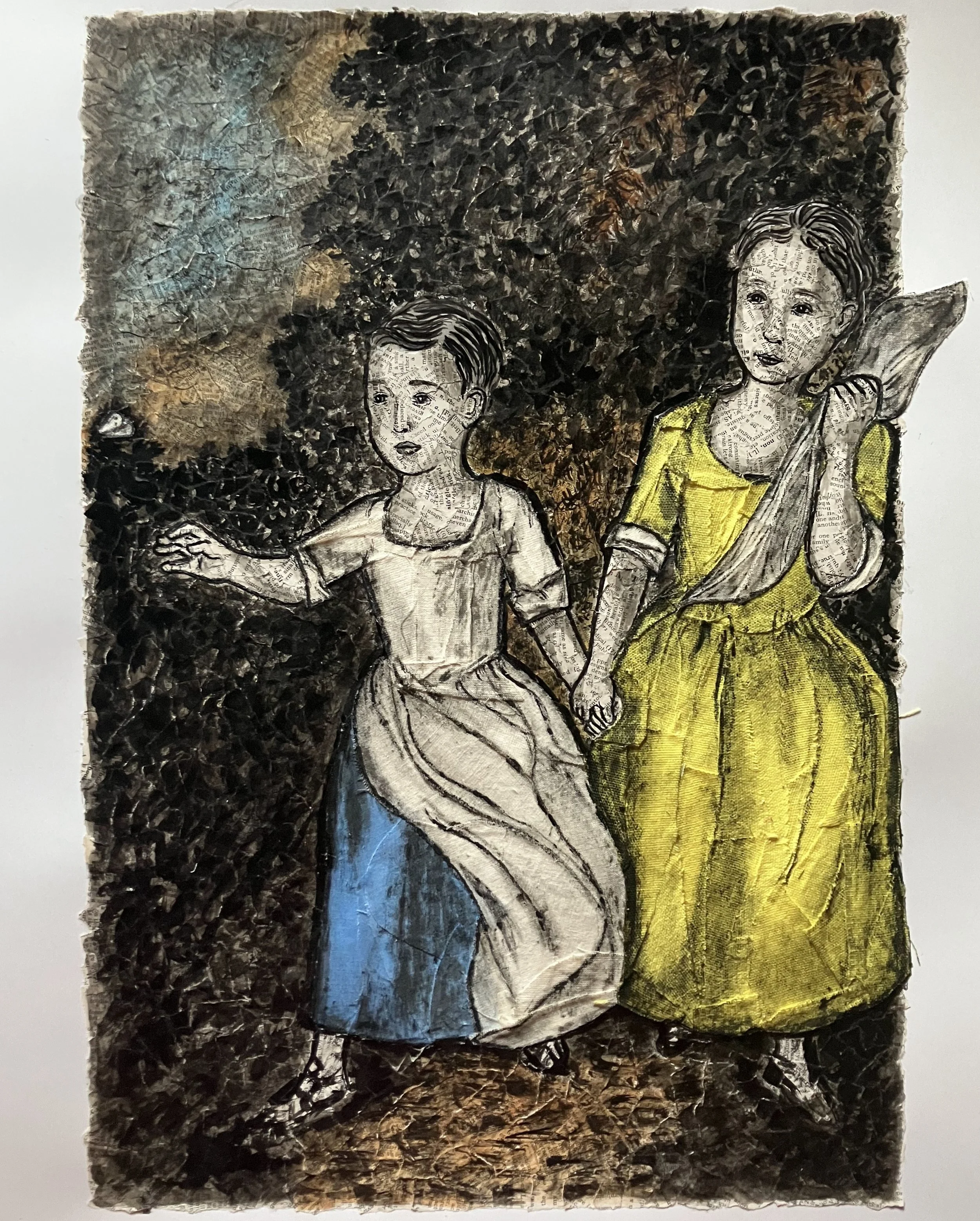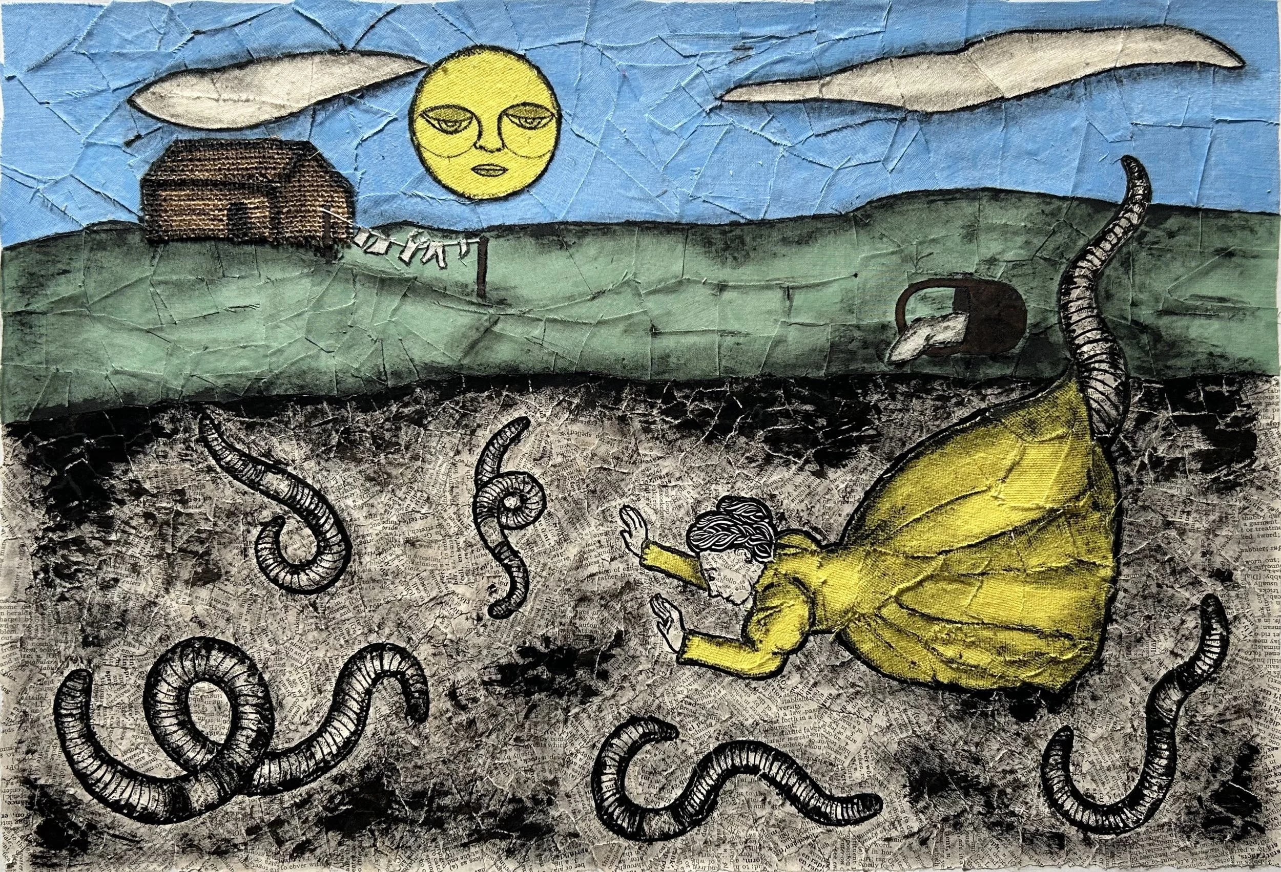 I work with pen and ink, brushes, watercolor, fabric, and paper scraps to create layered works of art inspired by folklore and personal memory.