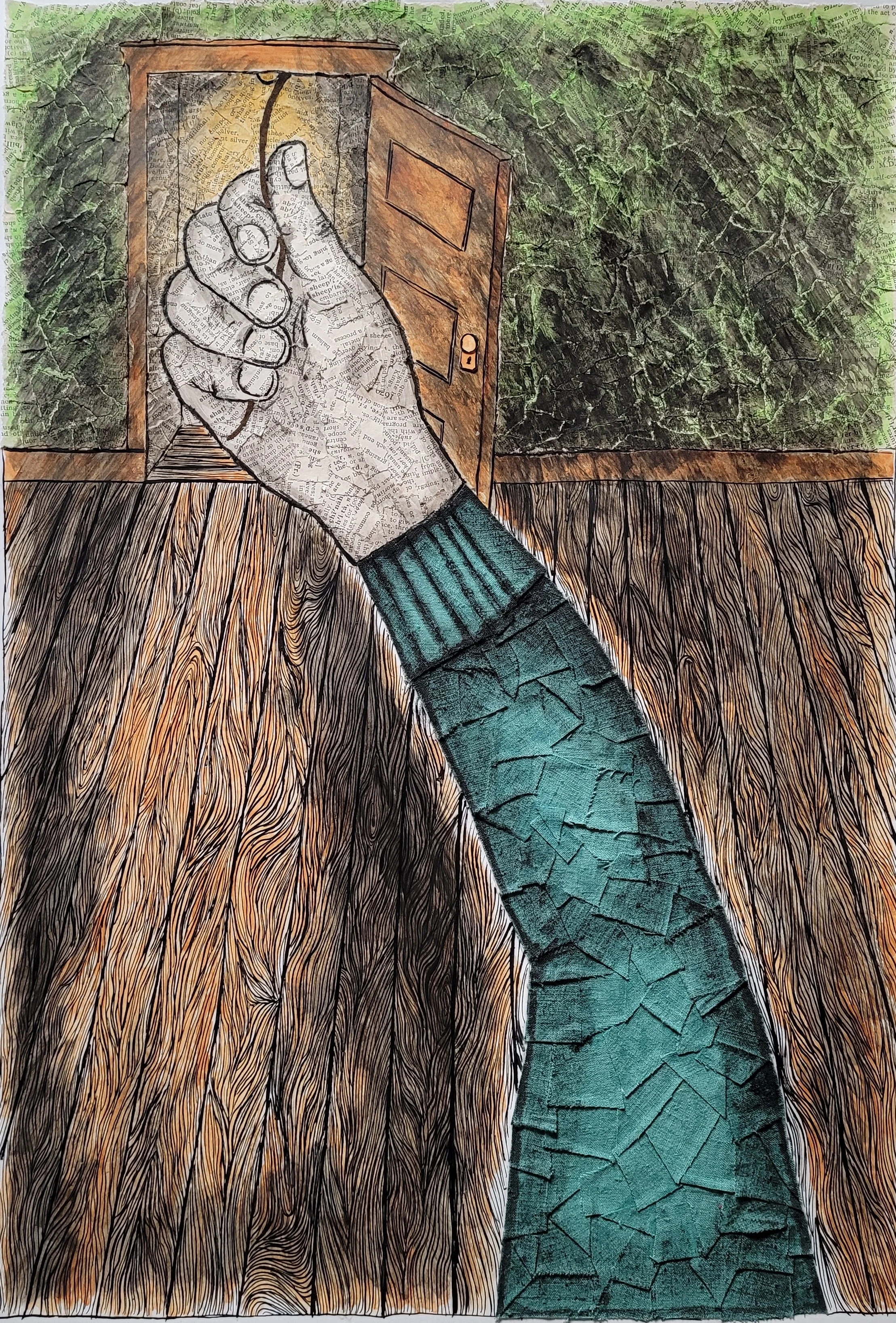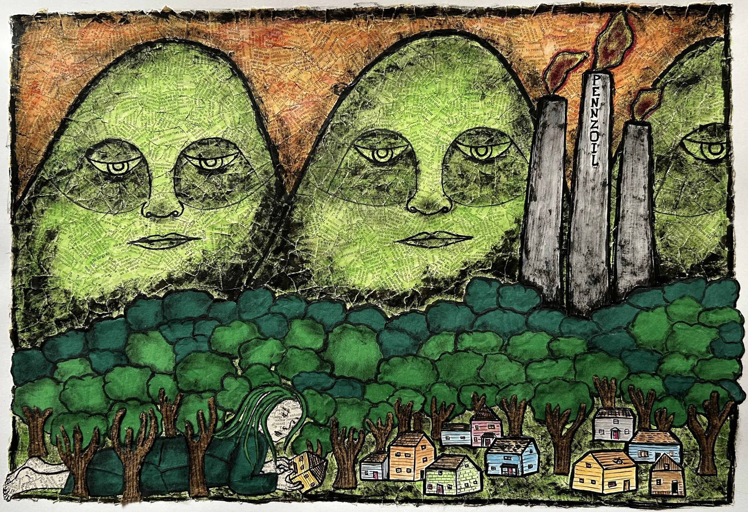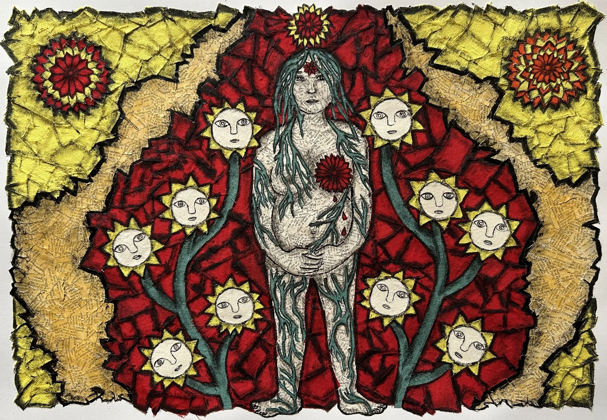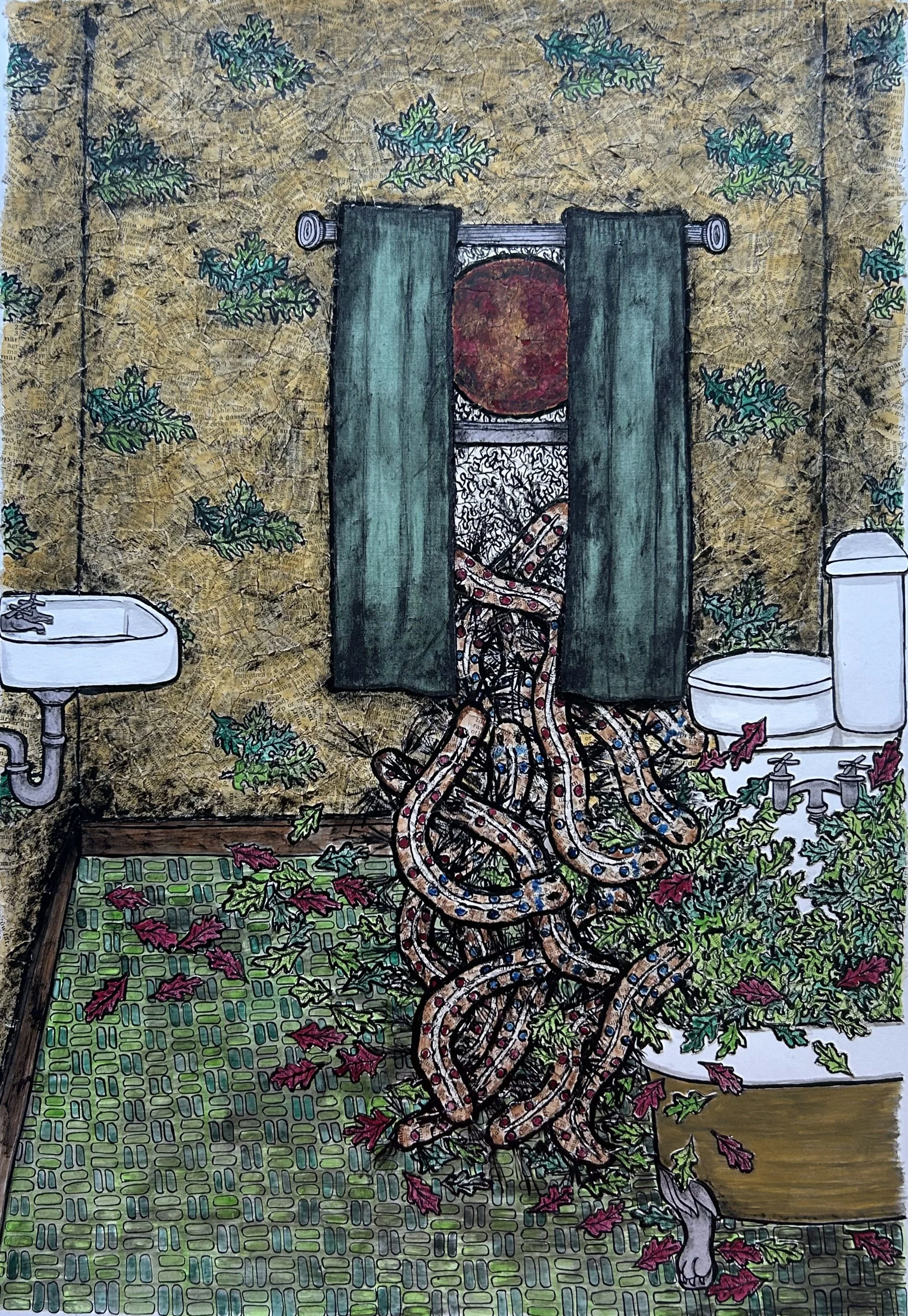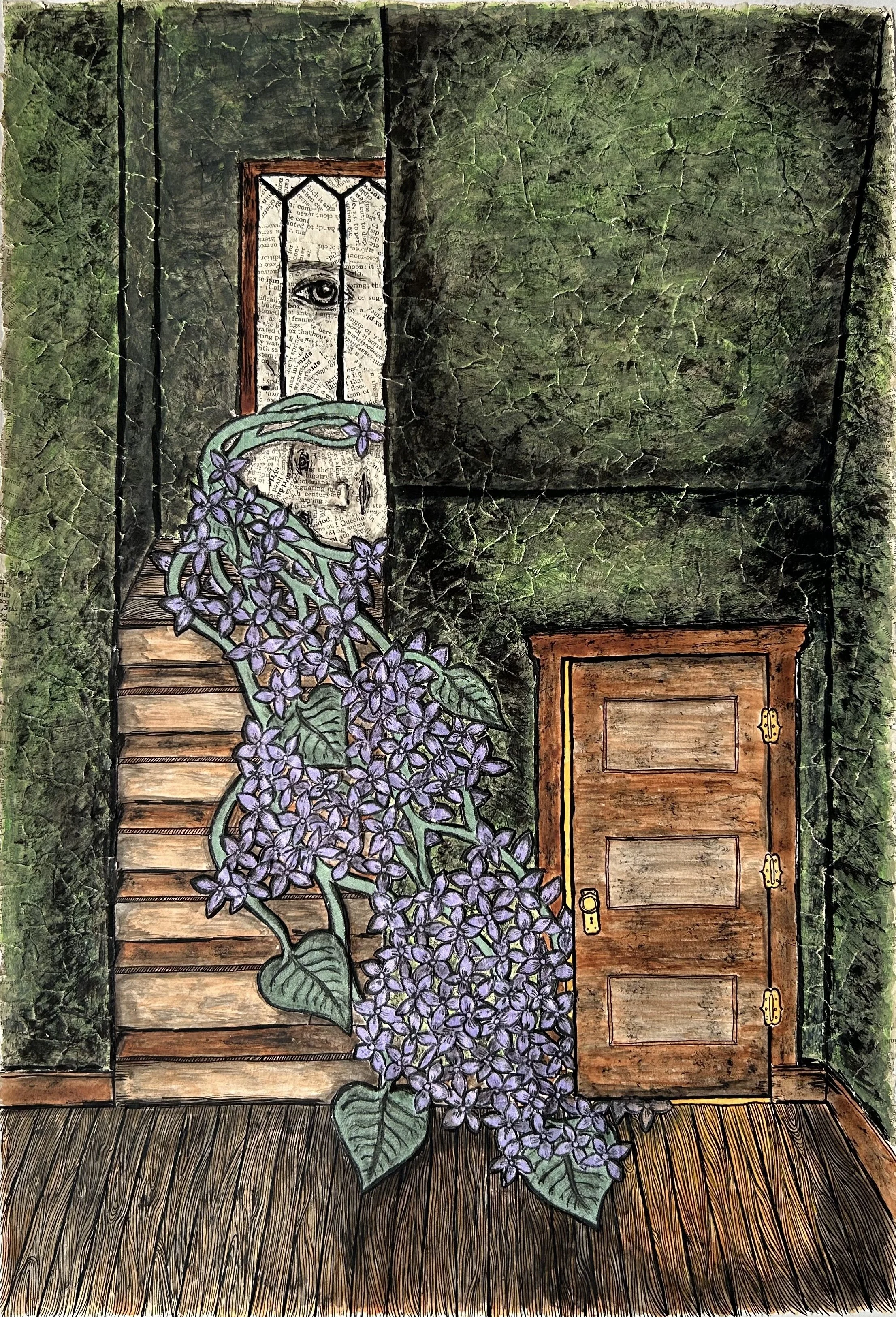 I work with pen and ink, brushes, watercolor, fabric, and paper scraps to create layered works of art inspired by folklore and personal memory.